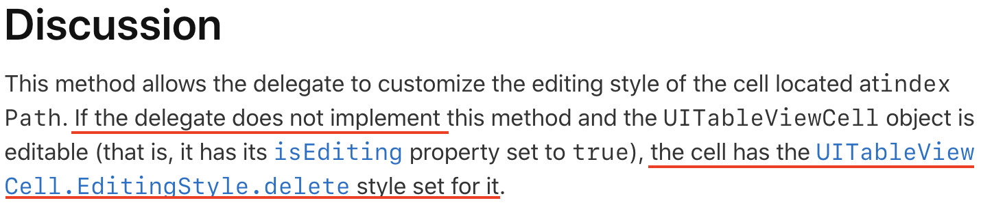 tableView(_:editingStyleForRowAt:)를 구현하지 않으면 cell의 editingStyle을 delete로 set 한다고 한다.