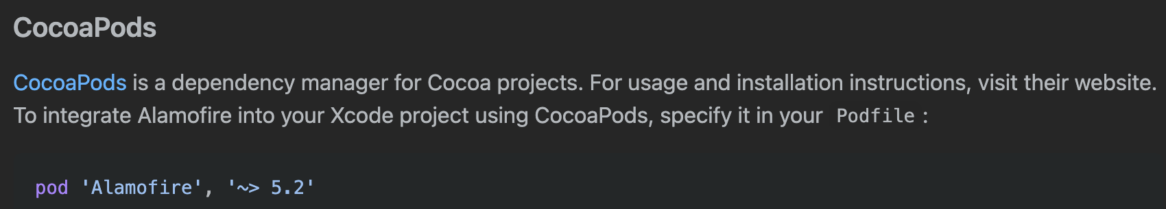 이제 Alamofire의 Installation 으로 가보면 어떻게 설치해야하는지가 나와있다.
