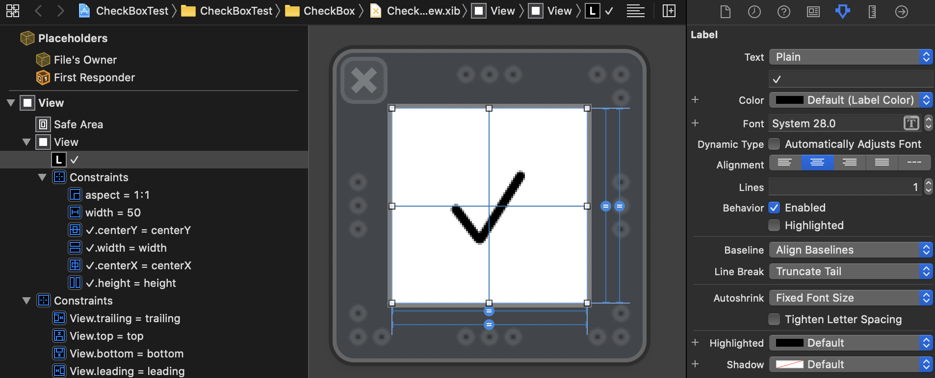 여기에 UIView를 추가하고 그 안에 Text가 ✓인 UILabel을 추가하고 Constraints를 지정한다.
