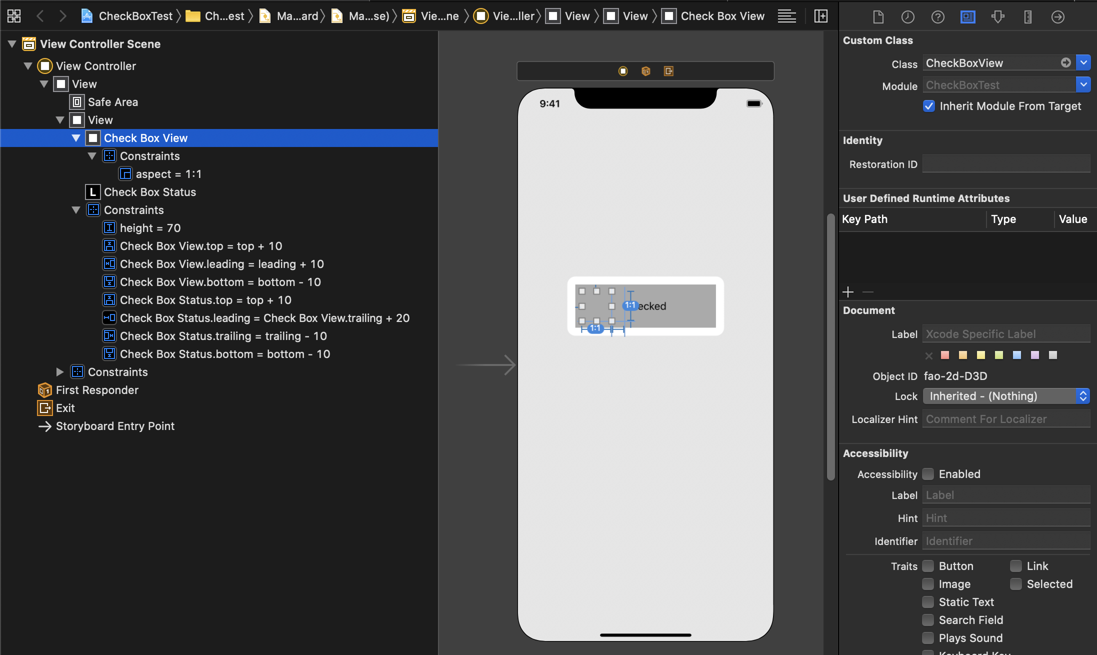 1) ViewController에 추가된 CheckBoxView를 클릭
